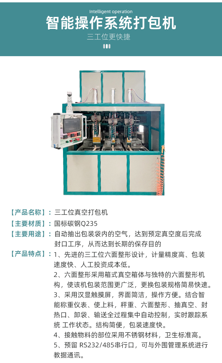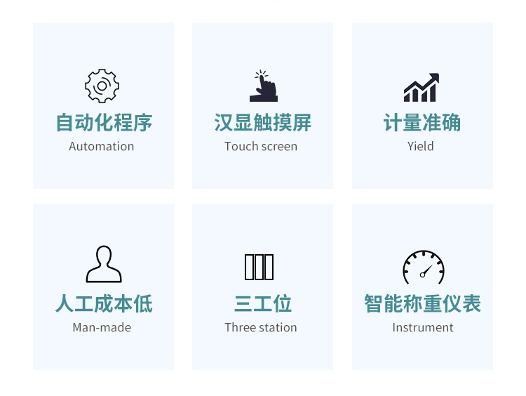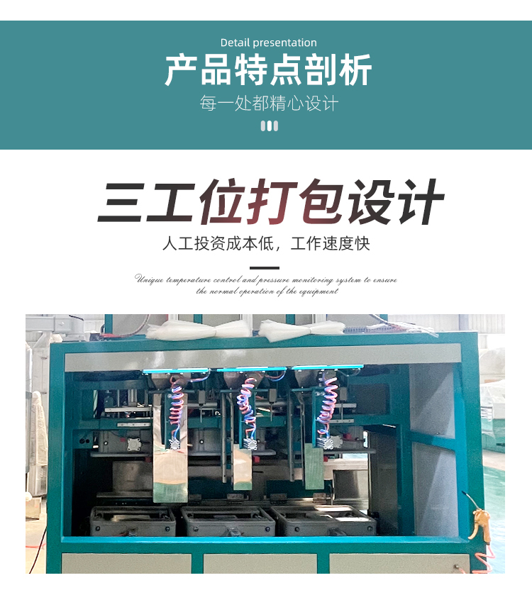 1、先進(jìn)的三工位六面整形設(shè)計,計量精度高、包裝速度快、人工投資成本低。